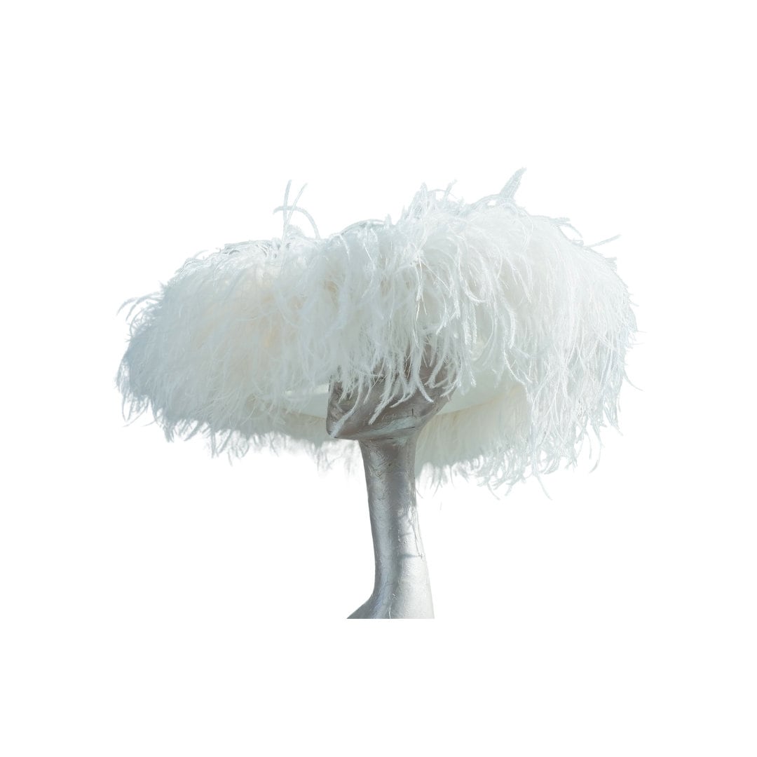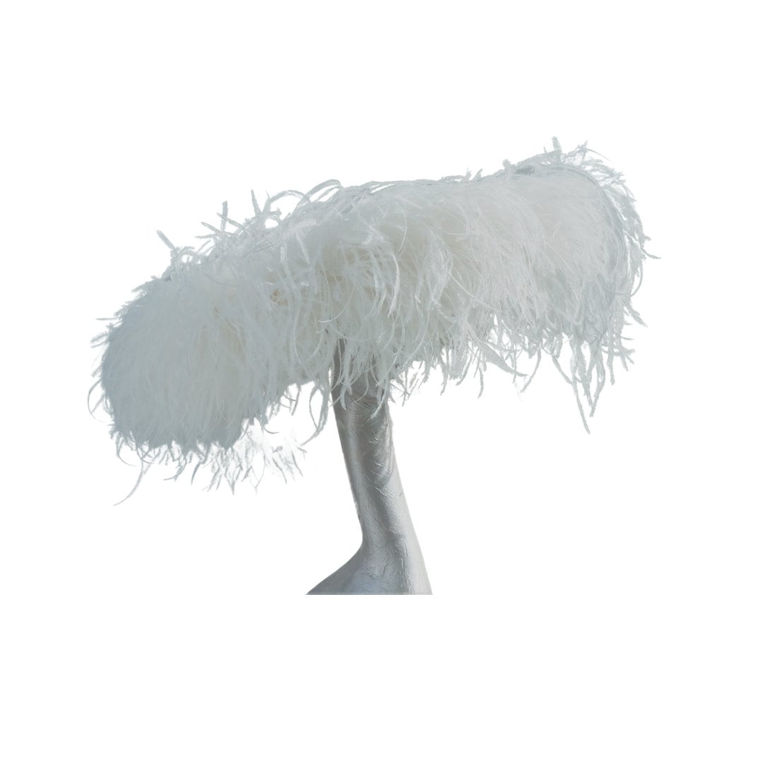 The most fabulous extra large feature hat in Ivory with a mass of 5 ply ostrich feathers in a boa formation a truly stunning masterpiece by Marie-Anne of Hats2go a statement piece for an daring Mother of the bride or a stand out in the crowd piece at Ascot or the Kentucky Derby. This hat can be made in many more colours so please email me if you are interested in ordering another colour.